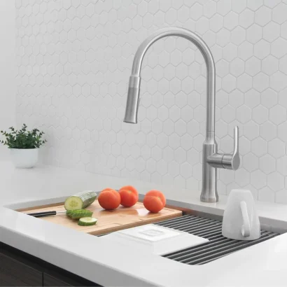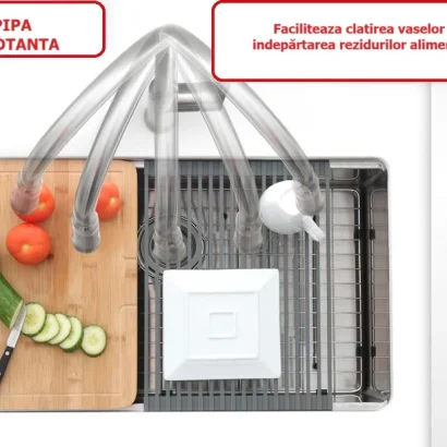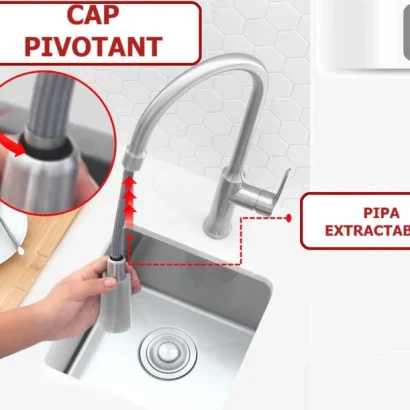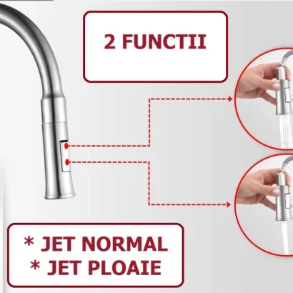 Bateria de bucatarie are un design modern. Pipa este extractabila pentru o raza extinsa si miscare mai ampla. Avand 2 functii (normal si ploaie) faciliteaza clatirea vaselor si indepartarea reziduurilor alimentare. Este realizata din otel inoxidabil, include sistemul de prindere si racord flexibil.