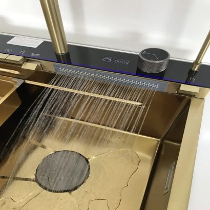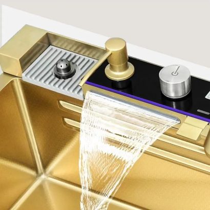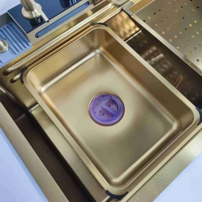 Chiuveta de bucătărie Multifuncțională din Inox cu LED, culoare Auriu, cu dimensiunile 75×45 cm, este o soluție completă și practică pentru spațiul de bucătărie. Acest set conține următoarele elemente: chiuvetă, baterie chiuvetă multufuncțională cu contragreutate, baterie apă potabilă, filtru apă, racorduri, sifon, dop scurgere, scurgător legume/fructe, scurgător vase, sistem jet spălat pahare, dozator săpun, tocător, schiță montaj, led incorporat.