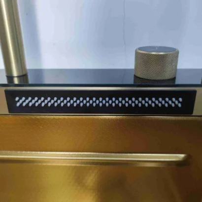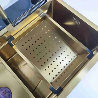 Chiuvetă: Realizată din oțel inoxidabil de înaltă calitate, cu finisaj într-o nuanță elegantă de auriu, chiuveta este robustă și rezistentă la coroziune și zgârieturi. Cu dimensiuni de 75×45 cm, oferă un spațiu generos pentru spălatul vaselor și pregătirea alimentelor. Model honeycomb rezistentă la zgârieturi, nu rămân urme, picături de apă, se șterge foarte ușor.