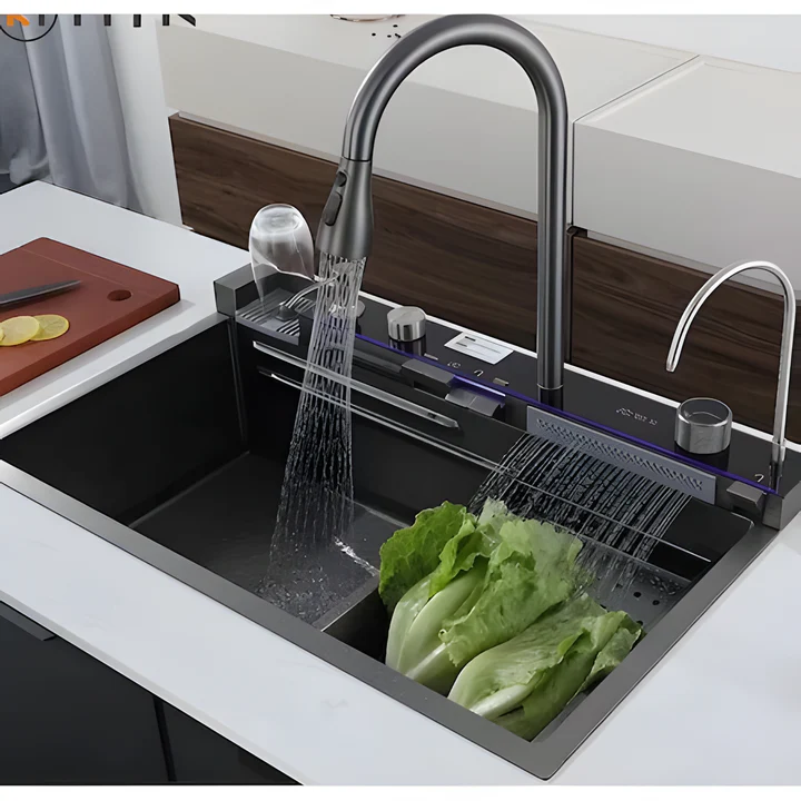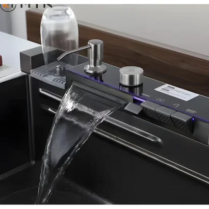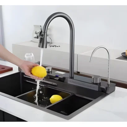 Designul său inteligent include două cuve spațioase și o masă de lucru din lemn natural, care adaugă o notă caldă și elegantă. Inovațiile nu se opresc aici – cele două cascade (una tip cascadă și una tip ploaie) oferă opțiuni variate pentru utilizare, în timp ce afișajul LCD inteligent furnizează informații utile despre temperatura apei și durata de utilizare.
