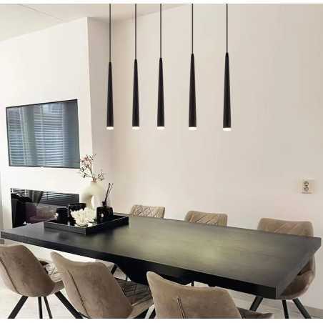 Perfectă pentru un interior modern, Este o lustră de design ce poate fi folosită ca element distinctiv pentru amenajarea unei zone de dining, bucătărie, living sau chiar dormitor.