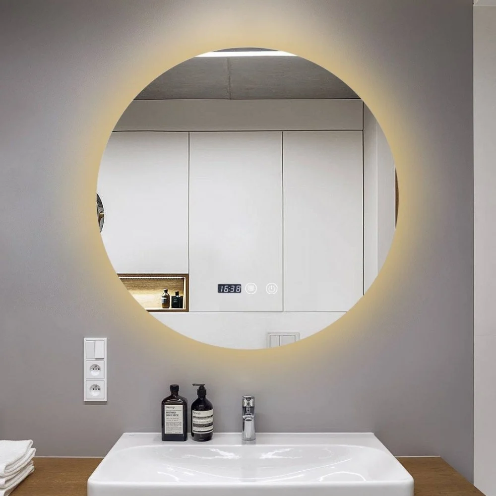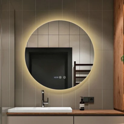 Lumină ambientală în spate: O caracteristică distinctivă a acestei oglinzi este lumina ambientală integrată în partea din spate a acesteia. Această lumină subtilă poate crea o atmosferă relaxantă în baie și poate funcționa și ca sursă de iluminare suplimentară în baie, fără a fi necesară aprinderea altor luminări.