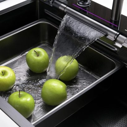 Chiuveta de bucătărie Multifuncțională din Inox cu LED, culoare Gri Închis, cu dimensiunile 75×45 cm, este o soluție completă și practică pentru spațiul de bucătărie. Acest set conține următoarele elemente: chiuvetă (gri închis), baterie chiuvetă multufuncțională cu contragreutate(neagră), baterie apă potabilă (inox, satinat), filtru apă, racorduri, sifon, dop scurgere, scurgător legume/fructe, scurgător vase, sistem jet spălat pahare, dozator săpun(negru), tocător, schiță montaj, led incorporat.