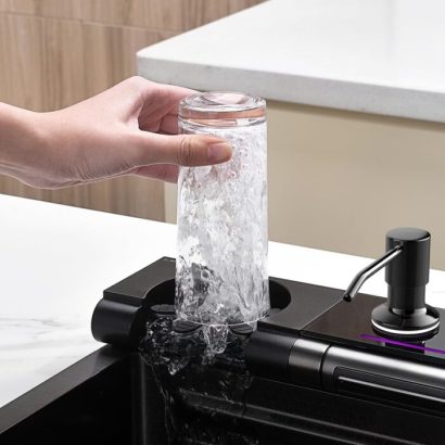 Exact! Ai citit bine! Poate una dintre cele mai spectaculoase funcții ale acestei Chiuvete Multifuncționale este Afișajul digital care alături de banda LED este acționat automat prin presiunea apei, exact ca un dinam electric. Nu ai nevoie de conectare la rețeaua electrică sau de baterii, totul se întâmplă ca printr-o magie.