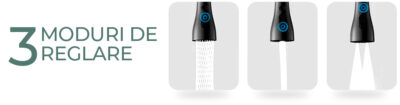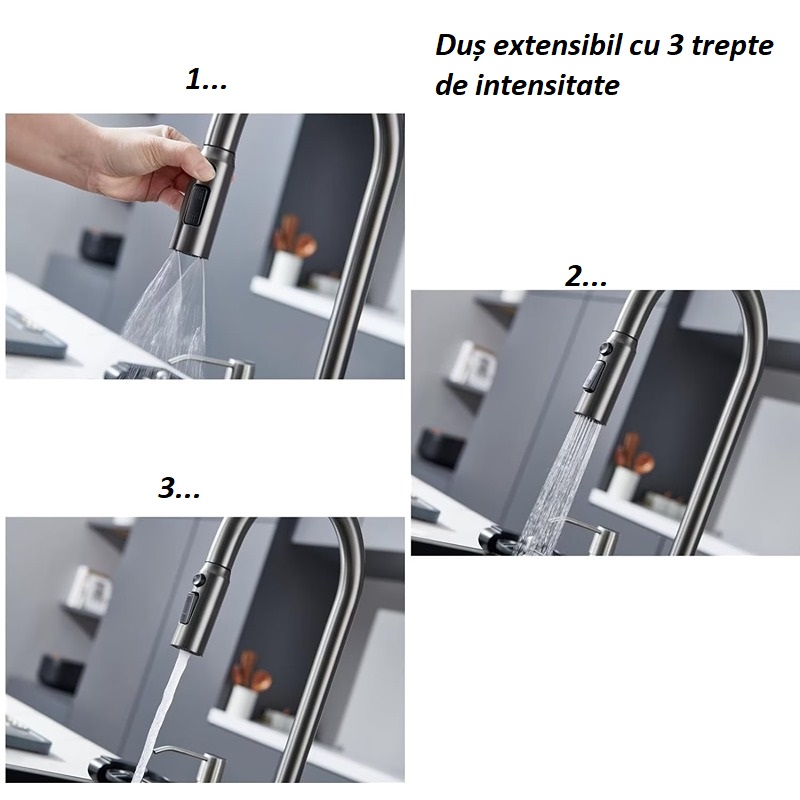 Dușul este extensibil, iar capătul dispune de 3 trepte de reglare a intensității și a modului de dispersare a apei. Presiunea este excelentă iar mobilitatea de asemenea!
