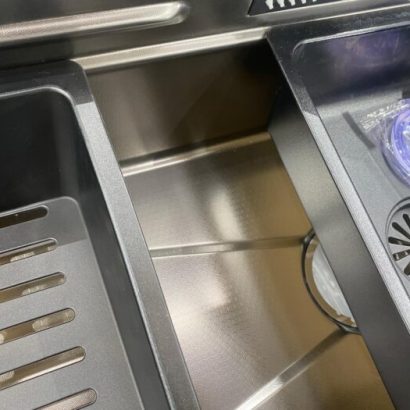 Chiuveta de bucătărie multifuncțională din inox, în nuanța gri închis – negru, dimensiuni 100×45 cm, este un element modern și practic pentru orice bucătărie. Materialul din inox îi conferă durabilitate și rezistență la coroziune, fiind ușor de întreținut și rezistent la temperaturi ridicate. Finisajul gri închis-negru adaugă un aspect elegant și contemporan, potrivindu-se perfect în bucătăriile cu design minimalist sau industrial.